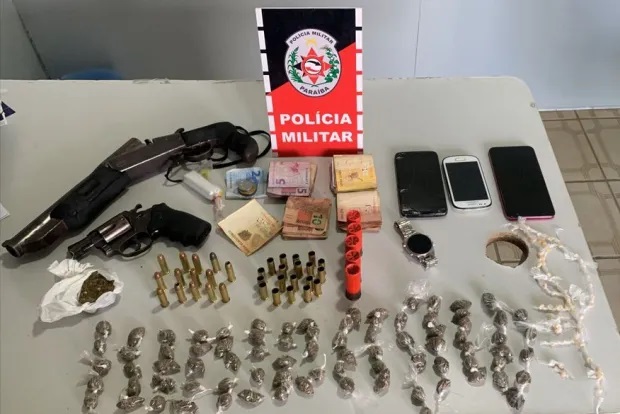 Após realizar buscas no interior do local, foram apreendidas uma espingarda calibre .12 com cinco munições intactas; um revólver calibre .38 com numeração raspada e 14 munições intactas e 19 deflagradas; 82 porções embaladas de substância análoga a maconha; 60 pedras análogas a crack; quatro aparelhos celulares e R$ 658,50 em espécie.