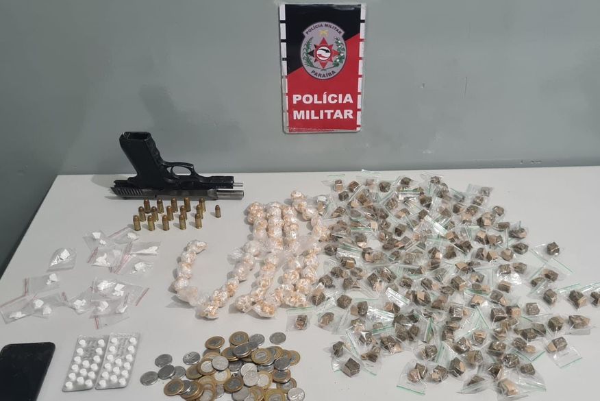 Na abordagem, foram encontradas uma pistola calibre .40, 450 pedras de crack, 160 trouxas de maconha e 17 papelotes de cocaína.