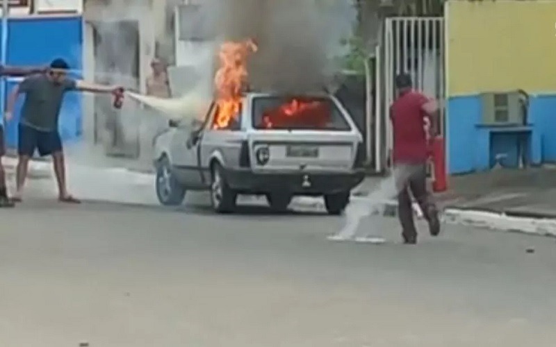 Imagens obtidas pelo g1 mostram, em outro ângulo, o veículo em chamas e várias pessoas desesperadas tentando controla-las com o uso de extintores.