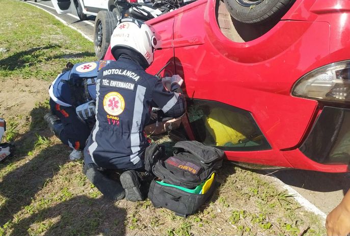 Um carro capotou na manhã deste domingo (21), nas proximidades do Centro de Convenções, na pista sentido João Pessoa – Jacumã, na Capital.