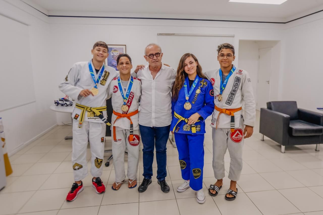 O prefeito Cícero Lucena recebeu, na manhã desta quarta-feira (14), em seu gabinete, em Água Fria, a visita de quatro medalhistas de ouro do Campeonato Sul-Americano de Jiu-Jitsu Criança 2022. O evento aconteceu no Rio de Janeiro, no último mês de agosto, e viu todos os atletas pessoenses no lugar mais alto do pódio em suas categorias. Eles viajaram com apoio da Prefeitura da Capital e se reuniram com o gestor para agradecer o suporte dado.