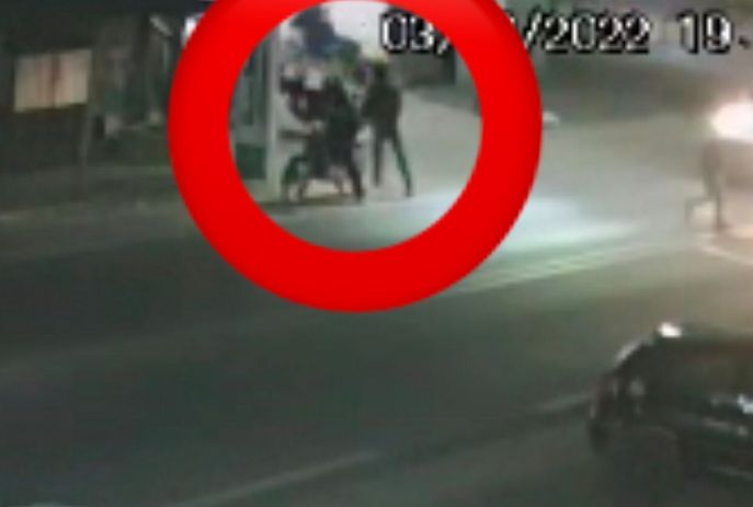 Câmeras do circuito de segurança de estabelecimentos na região registraram a ação dos criminosos. Dois homens encapuzados chegam de moto, um deles aborda a vítima e dispara.