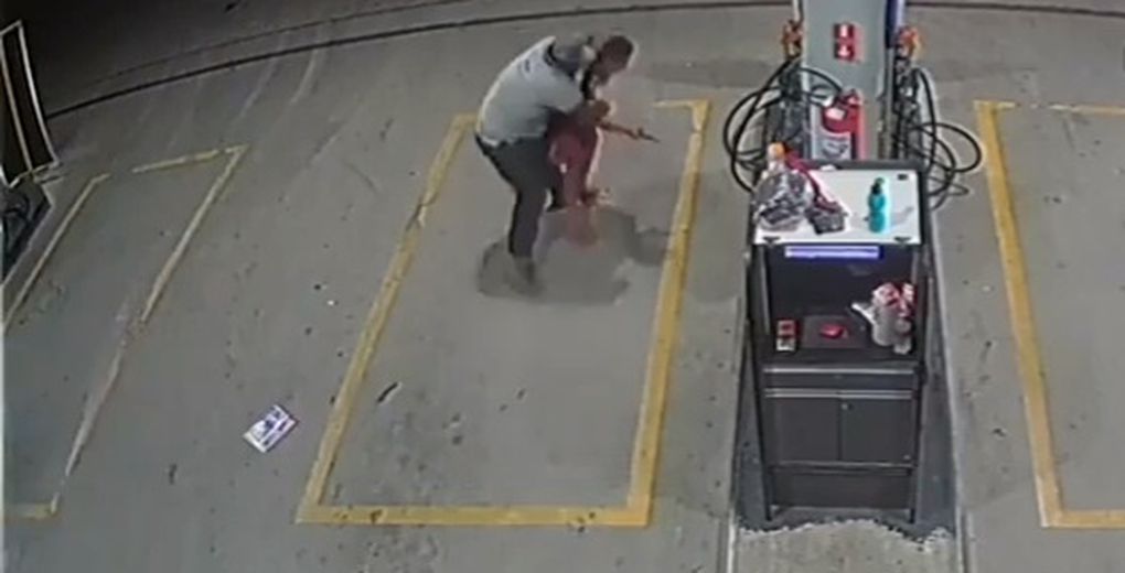 As imagens do circuito interno de câmeras de segurança mostram o momento em que o funcionário do posto reage à abordagem do suspeito, entra em luta corporal e toma a arma do assaltante.