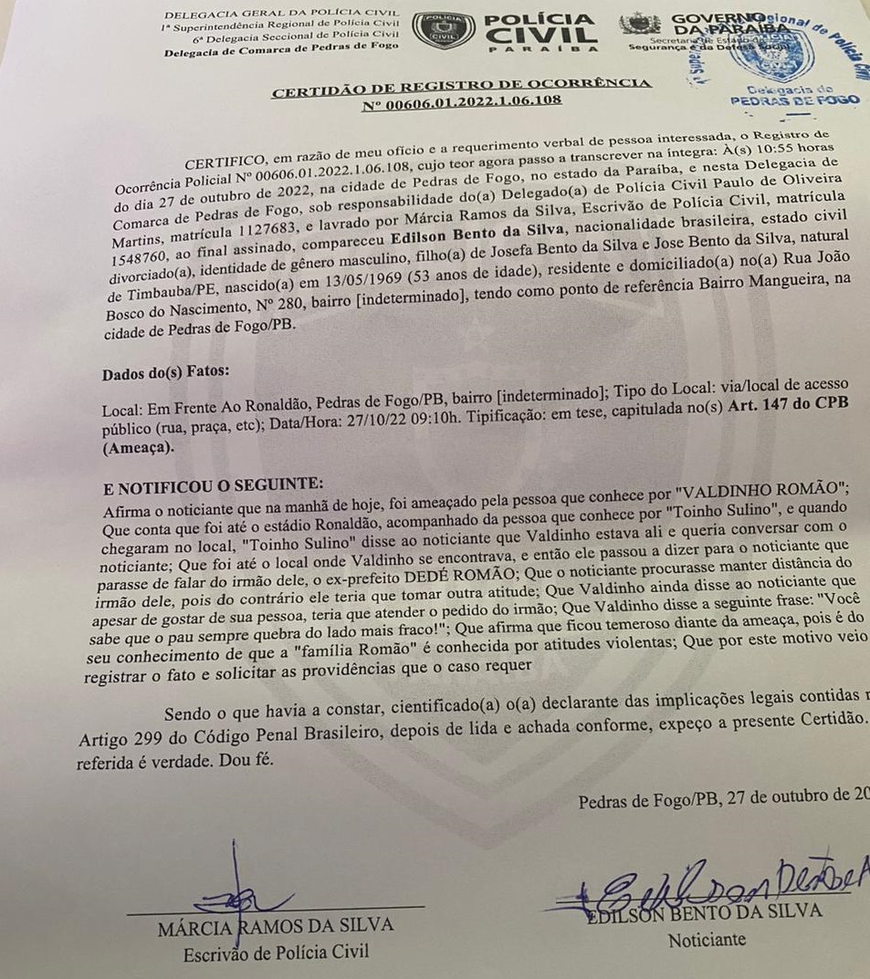 Conforme TCO registrado da Delegacia local, ele afirmou ao cidadão conhecido na cidade por Maozinha que, o Pau quebra nas costas do mais fraco. Valdinho Romão ja ocupou cargos nos Governos de Ricardo Coutinho e Joao Azevedo, como a diretoria da Empasa e Imeq.