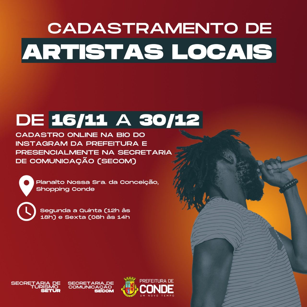 A Prefeitura de Conde, por meio das Secretarias de Comunicação e Turismo, abriu o cadastro para os artistas locais, com o objetivo de criação de um banco de dados, além da adequação e execução da Lei Nº 1155/2022, que estabelece a participação de artistas locais durante os grandes eventos da cidade.