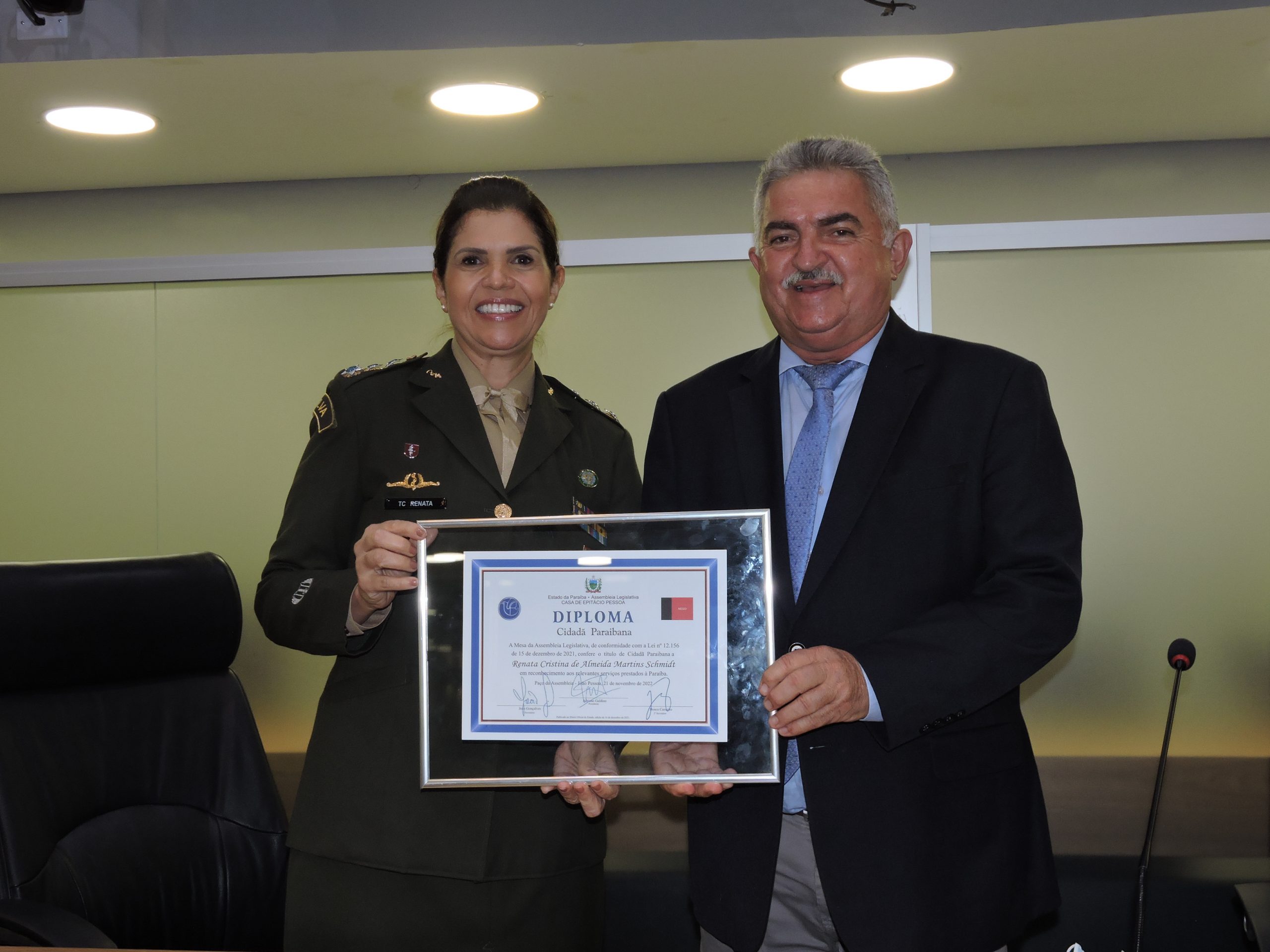 A Assembleia Legislativa da Paraíba (ALPB) realizou sessão solene, na tarde desta segunda-feira (21), para entregar o título de Cidadã Paraibana à tenente Coronel Renata Cristina de Almeida Martins Schmidt, do Exército Brasileiro, pelos relevantes serviços prestados ao estado. A homenagem foi proposta pelo deputado João Gonçalves. Oficiais, praças e servidores da corporação prestigiaram o evento realizado no plenário da ALPB.