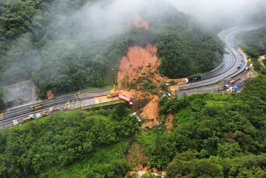 Duas pessoas morreram e seis já foram resgatadas com vida. Ao menos 15 carros e seis caminhões foram carregados pela terra que deslizou sobre a rodovia.