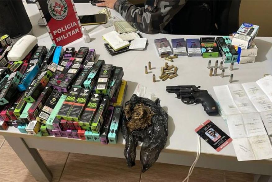 Conforme apurou nossa reportagem, o homem foi interceptado pela polícia quando conduzia um veículo. Os militares apreenderam com o indivíduo um revólver, munições, drogas, cigarro eletrônico e dinheiro.