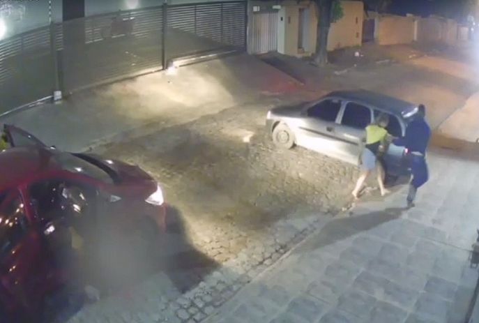 Tudo aconteceu por volta das 18h15. Uma câmera de segurança registrou o momento em que três criminosos pararam em frente ao carro das vítimas, desceram e obrigaram uma delas a entrar no veículo deles. Dois criminosos renderam a outra pessoa e entraram no carro. Em seguida, fugiram.