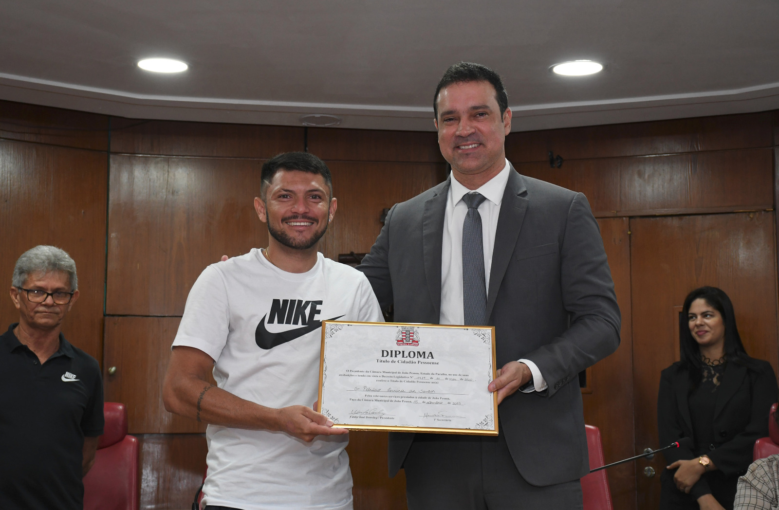 “Tenho certeza que São José do Brejo do Cruz vai ter muita honra em emprestar um pouco esse filho para João Pessoa. Que você tenha sempre esse norte, esse respeito à família, o exemplo que sua família pode dar a você. E que o esporte, através da sua competência, da sua equipe, possa não somente atingir novos recordes, mas que venha a mudar o futuro de tantas outras crianças que querem ser um ‘Petrúcio’ lá na frente”, destacou Thiago Lucena, ressaltando a grande honra de poder homenagear o atleta.
