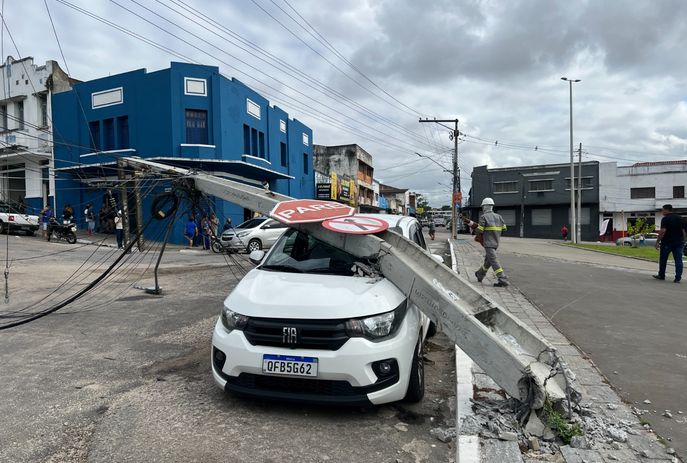 Poste cai sobre carro de motorista por aplicativo, no Varadouro