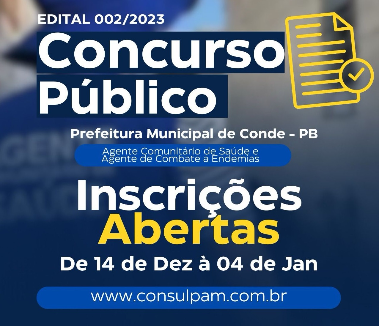 A Prefeitura Municipal de Conde lançou o edital do Concurso Público para os cargos de Agente Comunitário de Saúde (ACS) e Agente Comunitário de Endemias (ACE). São 36 vagas, sendo 14 para contratação imediata, além da formação de cadastro de reserva. As inscrições iniciam na quinta-feira, dia 14 de dezembro, com término no dia 04 de janeiro de 2024. O Instituto Consulpam será a empresa responsável pela realização do certame.