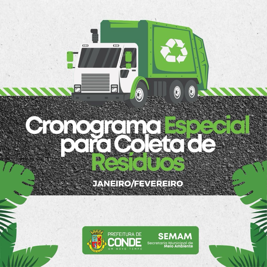 A prefeitura de Conde, por meio da Secretaria de Meio ambiente (SEMAM), montou um calendário especial para a coleta de lixo do município durante os meses de janeiro e fevereiro, por conta do grande fluxo de ocupação na região e os grandes eventos que vem ocorrendo no município desde o final de 2023 e o Projeto Verão e o Carnaval 2024.