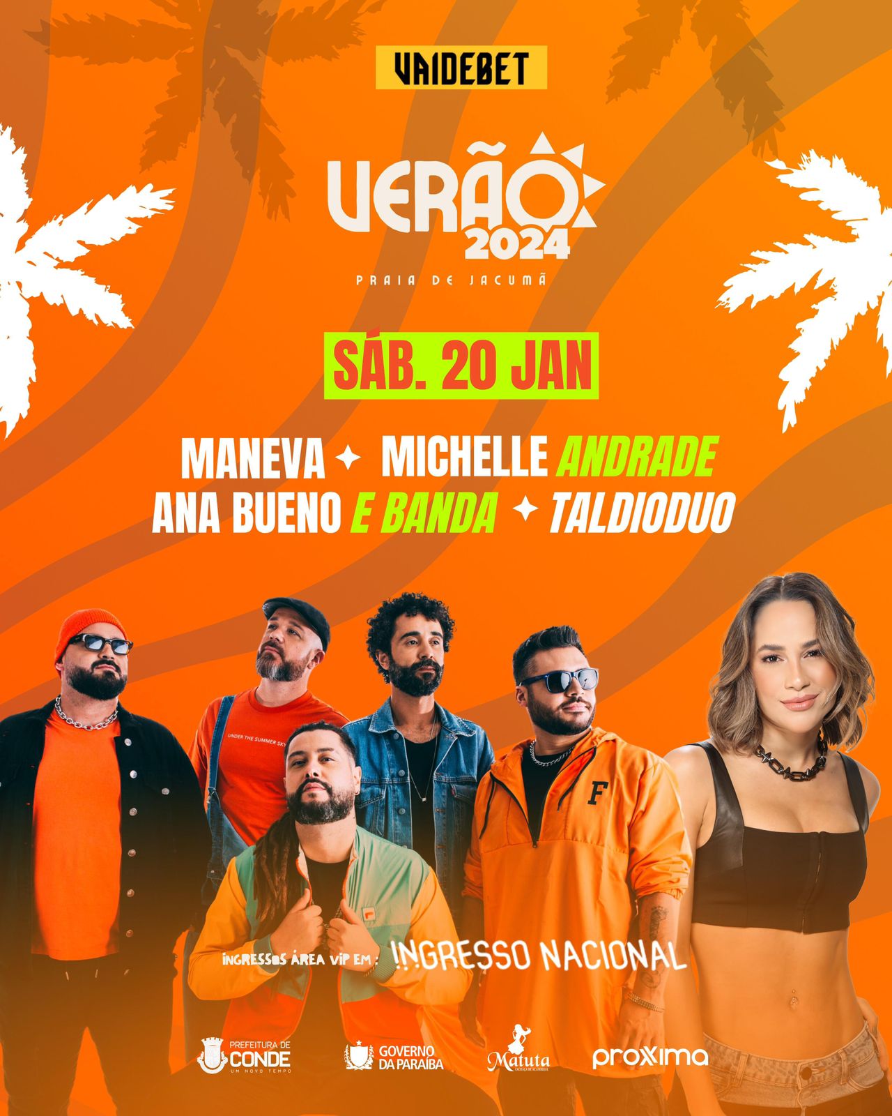 A Prefeitura de Conde promove neste sábado (20), mais uma noite de shows musicais do Projeto Verão 2024. O evento vem com uma programação de artistas locais, regionais e nacionais. Se apresentam neste sábado as Bandas Maneva e Taldioduo e as cantoras Ana Bueno e Michelle Andrade. As apresentações acontecem a partir das 20h, na Praça do Mar, na Praia de Jacumã.