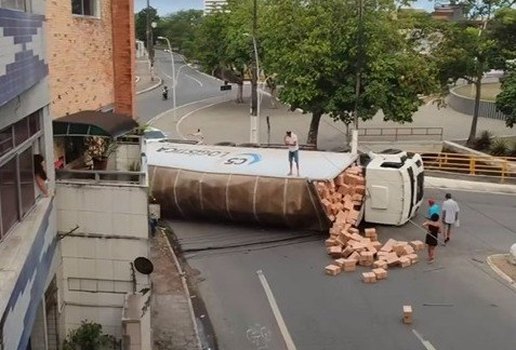 Um caminhão carregado de produtos alimentares tombou, na manhã desta segunda-feira (19), ao realizar uma manobra em uma rotatória no bairro Catolé, em Campina Grande, no Agreste da Paraíba.