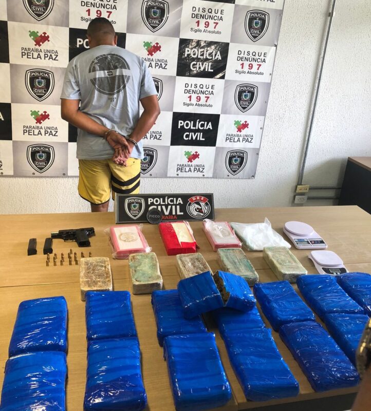 O homem foi encontrado no bairro do Valentina. Os policiais apreenderam, com ele, 15kg de maconha com a identificação em rótulo com a frase “O Rei do Skank”, 5kg de crack, 3kg de cocaína, uma pistola calibre 380 com dois carregadores, 22 munições, duas balanças de precisão e celulares.